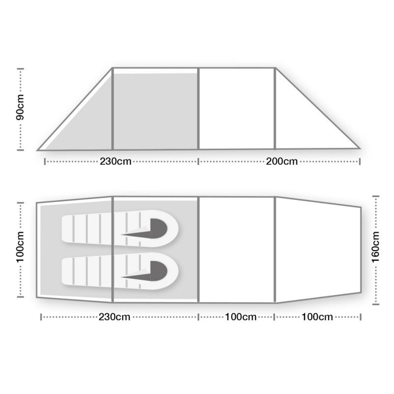 | Especificidades) | 21 postes en forma de V 12 tensores reflectantes Puerta con malla ventilada al 50% Concepto COMPACT (hebras compactas de postes de 30 cm para ahorrar espacio) Sistema EASYPITCH (fácil montaje con diferentes colores de los postes y marcas de montaje para los ojales) Sistema EASYPACK (bolsa de almacenamiento con correas de compresión y cordón para facilitar y agilizar el almacenaje de la tienda). |